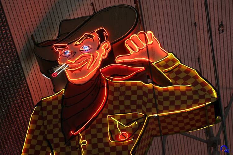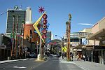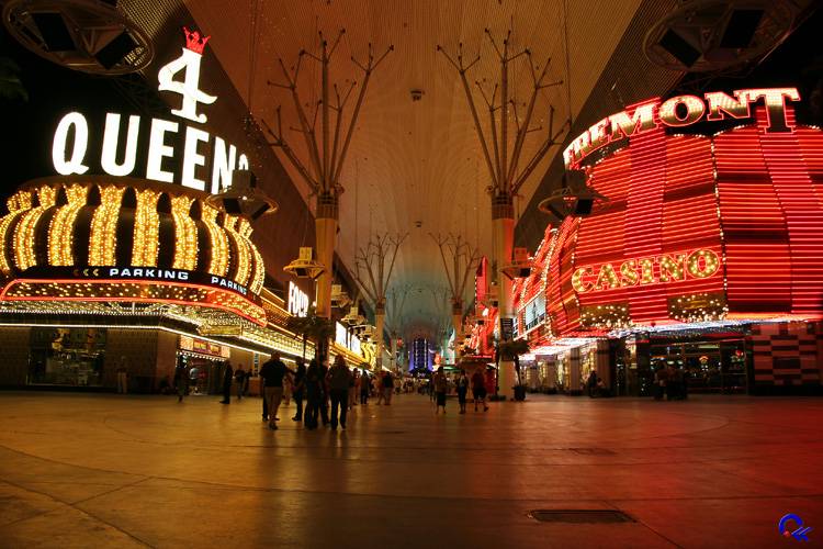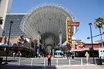 Nun waren wir also mitten in der Wüste im Spielerparadies und dies wollten wir uns natürlich auch anschauen. Nach dem Aufstehen um 9.30 Uhr machten wir uns auf zum Bus. Ursprünglich wollten wir ja Monorail fahren, aber die war unverschämt teuer. Also auf der Straße nach Downtown, dem alte Zentrum von Las Vegas, und nicht per Schiene. Dort angekommen gab's erstmal einen Gyros-Kebab zum Frühstück bzw. vielmehr schon Mittag. In der Fremont Street24, die teilweise mit einem leuchtenden Dach überdacht ist, schauten wir uns die alten Hotels und Casinos an. Auch noch einige der ursprünglichen Neonreklamen sind erhalten. Den größten Spielautomaten der Welt mit 3 mal 6 Metern im Four Queens Casino fanden wir leider nicht.