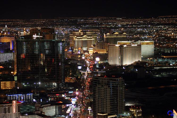 19 Uhr gings zurück in die Stadt. Erst mit der hoteleigenen kostenlosen Monorail zum Mandalay Bay30 und zum Luxor31 und dann wieder per Bus zum Stratosphere Tower. Wir wollten ja nun die Aussicht genießen und auch ein Fahrgeschäft nutzen. Wir entschieden uns für den X-Scream, einer Art Wippe, wo ein Wagen darauf vor und zurück fahren kann. Das ganze hängt über den Rand des Turms – wohlgemerkt in 350 m Höhe! Doch zunächst genossen wir die Aussicht auf die erleuchtete Stadt. Schon am Boden war teilweise ein recht ordentlicher Wind, doch auf der Aussichtsplattform konnte man sich manchmal kaum auf den Beinen halten. Das Fahren mit der vorhin erwähnten Wippe war gar nicht so wild wie es aussah, hat aber trotzdem Spaß gemacht. Ach ja, den einarmigen Banditen hab ich auch noch gefüttert. Waren zwar nur symbolische 1 Dollar, aber die Bank hat sich trotzdem gefreut, denn die gewinnt ja bekanntermaßen immer.